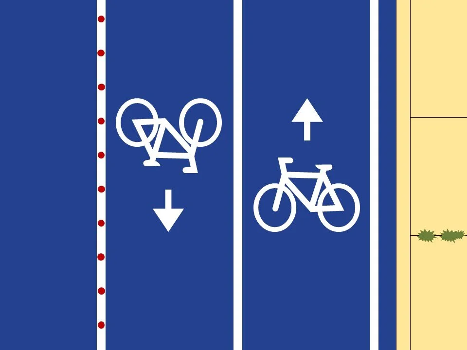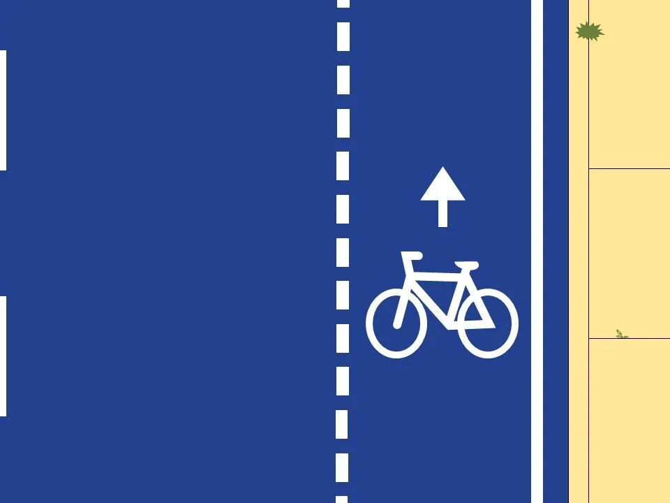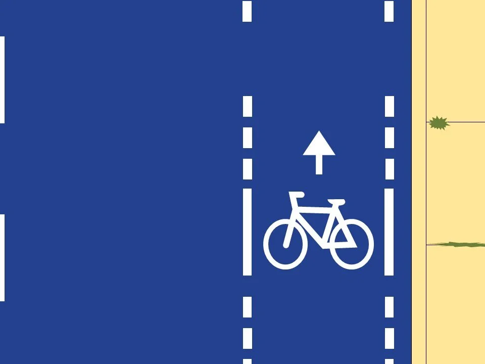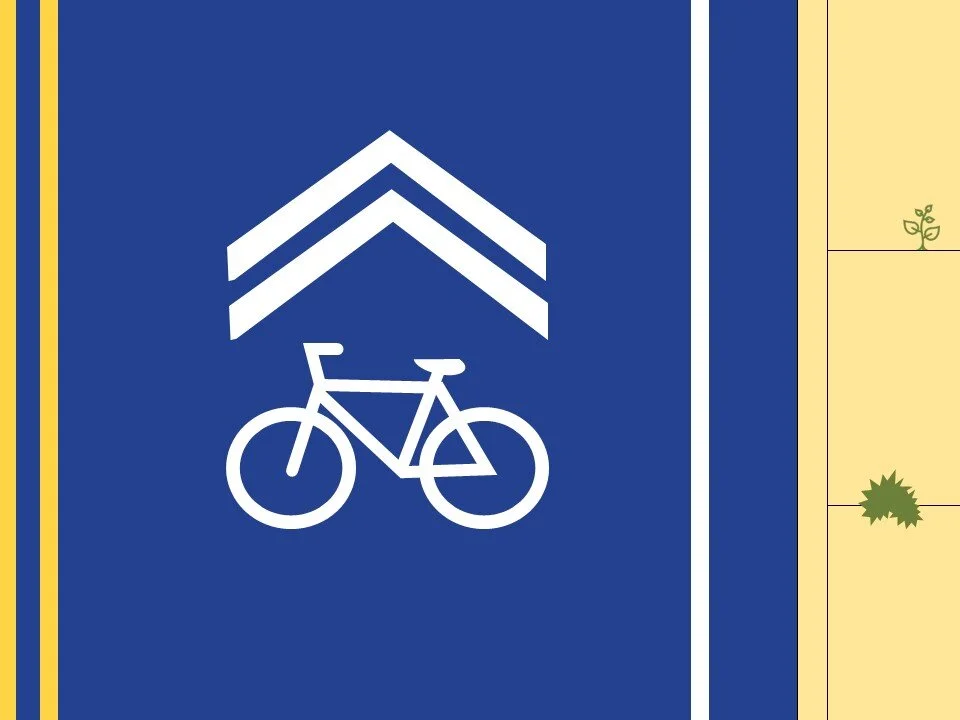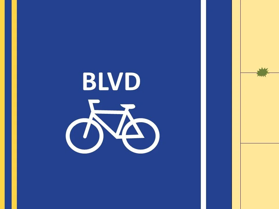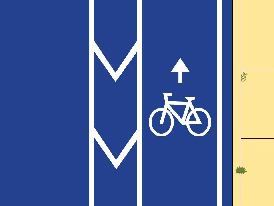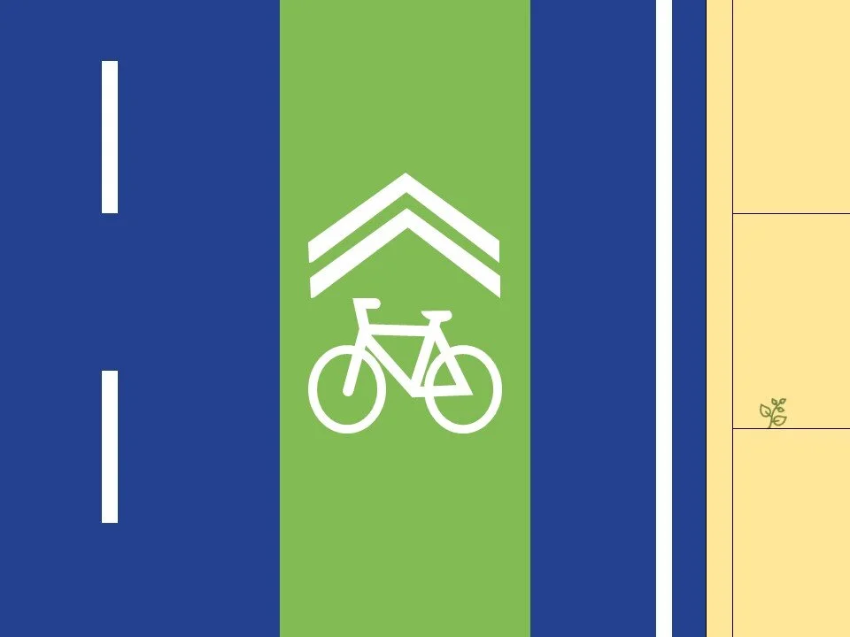 | Bike Boulevard A low-speed road designated for more travel on bike or on foot. People using Active Transportation should be understood as the main users of this road. | Advisory Bike Lane These lanes are commonly used on lanes that are too thin to accommodate all types of traffic at the same time. For example, a low traffic two-way road without a yellow centerline might expect cars to drive down the middle until the two cars need to pass each other. Then, the cars will each drift into the advisory bicycle lanes on their side of the road to pass, being mindful of bicyclists as they do so. |