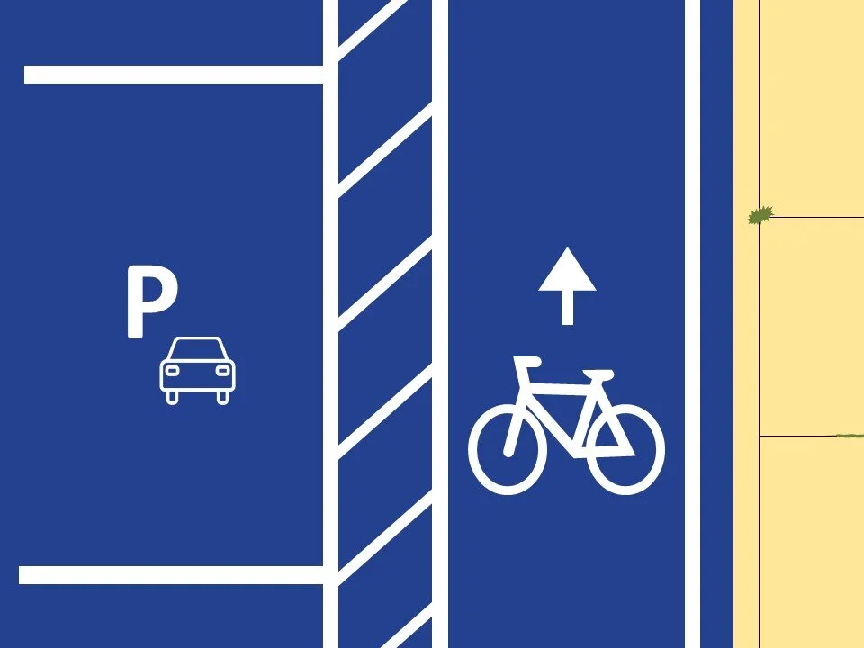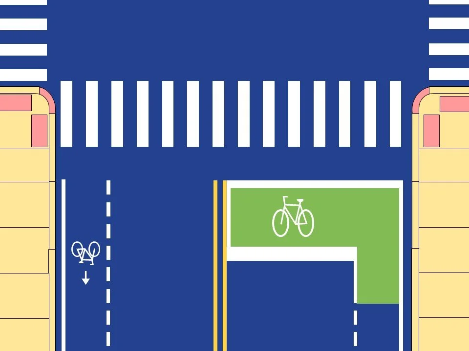 | Bike Box These markings help bicyclists turn left at a red light by putting them ahead of car traffic. Cars should stop before the first white line to wait for the light to change. | Parking Protected Bike Lane A protected bike lane that has a parking lane between the car and bike lanes. |