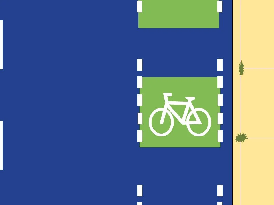 | Green Bike Lane Green lanes are used to signal to car drivers that they should yield to bicycles within this space. Parts of intersections are sometimes given green areas to remind turning drivers to be mindful of bicyclists. | Bike Way A two-way protected bike lane. May have traffic posts to separate them from car lanes. |